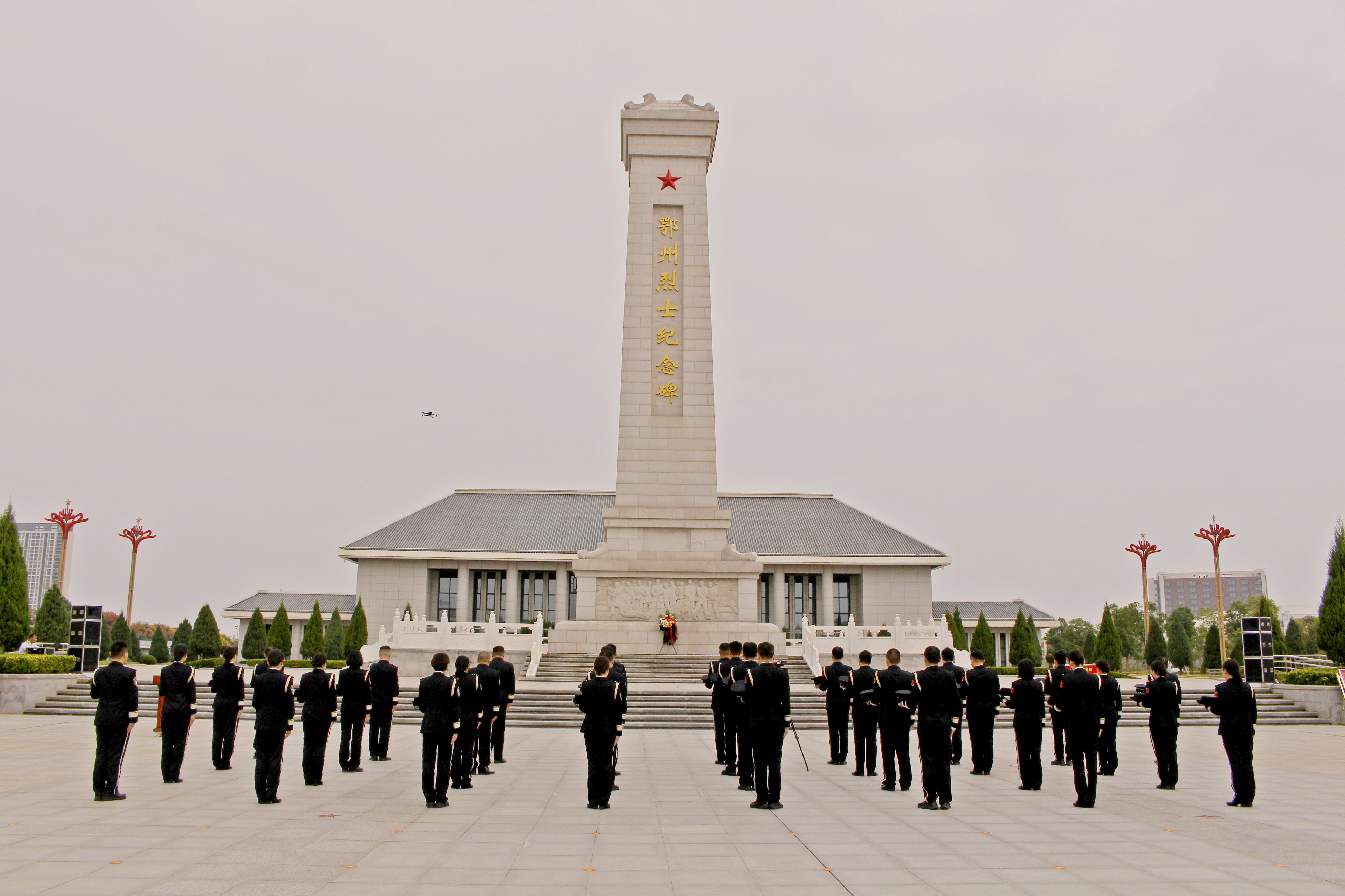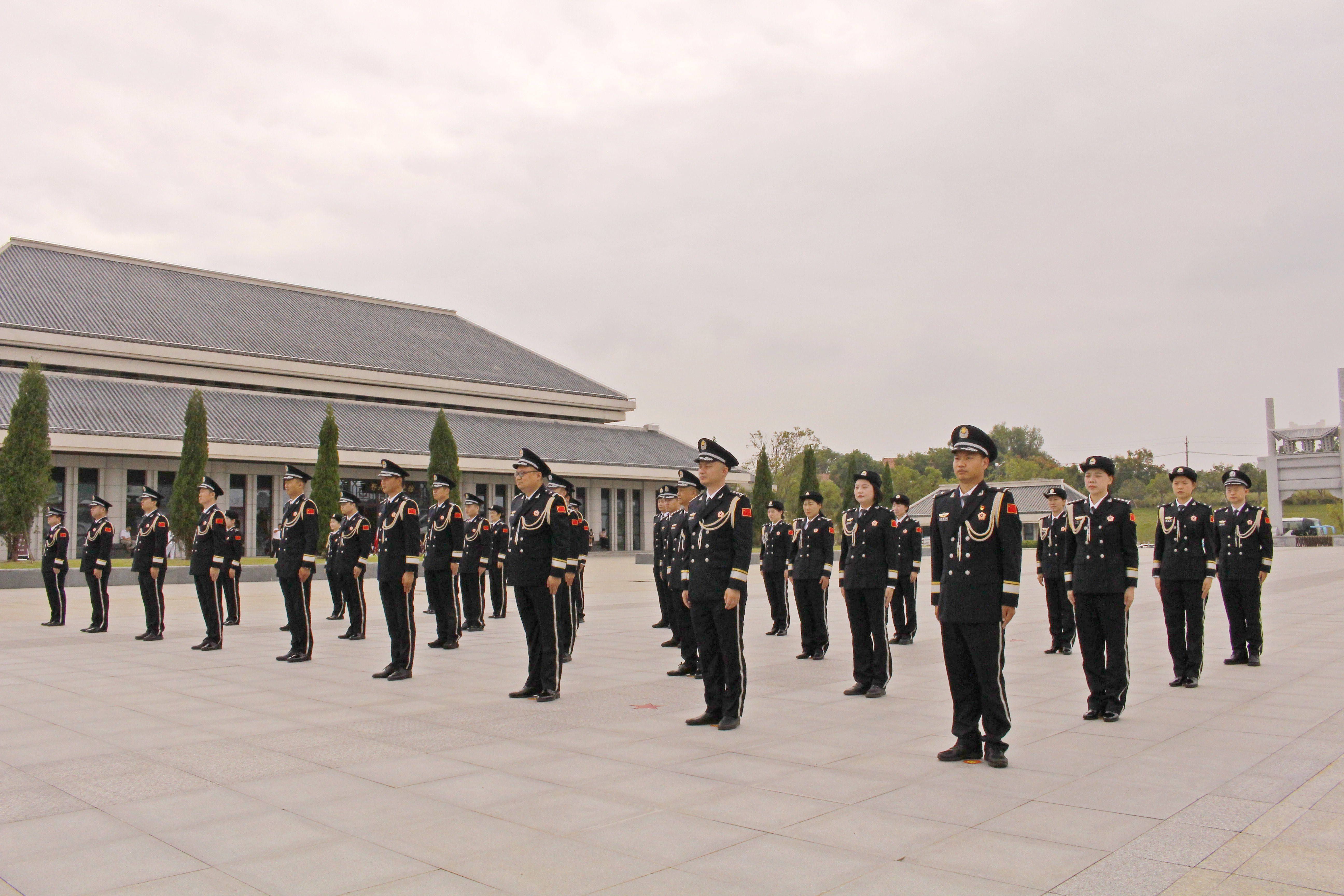 苍松翠柏掩映下的鄂州烈士纪念园庄严肃穆,民警代表整齐列队、神情庄重,脱帽肃立于巍峨的烈士纪念碑前。